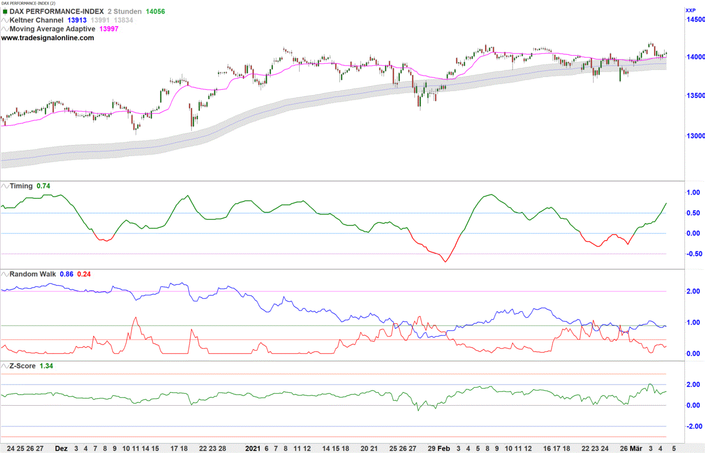 Für dieses positive Szenario spricht die markttechnische Konstellation im Intraday-Zeitbereich. Denn im Zweistundenchart notieren jetzt wieder alle Indikatoren in der Kaufzone, nachdem sich hier die Lage Ende Februar deutlich eingetrübt hatte. Inzwischen haben die Indikatoren erneut Momentum nach oben aufgenommen, sodass kurzfristig mit eher steigenden Kursen zu rechnen sein dürfte.