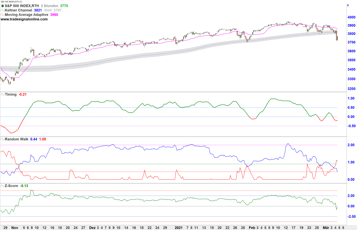 Dennoch bedeutete der Schlusskurs von 3768 Punkten beim S&P 500 den niedrigsten Stand seit Ende Januar. Die nächste Unterstützung befindet sich jetzt bei ungefähr 3690 Punkten. Darunter könnte das Barometer sogar bis zum ehemaligen Allzeithoch vom September des vergangenen Jahres bei 3595 Punkten abrutschen. Auf der Oberseite müsste der S&P 500 dagegen mindestens den GD(200) im Zweistundenchart bei 3821 Punkten zurückerobern, um sich in der aktuell prekären Situation etwas Luft zu verschaffen. Allerdings sieht es derzeit danach nicht aus. Denn alle Indikatoren notieren in diesem Zeitfenster im Short-Modus und signalisieren weiteres Abwärtspotenzial. Anleger sollten sich daher kurzfristig auf weiter fallende Kurse einstellen.