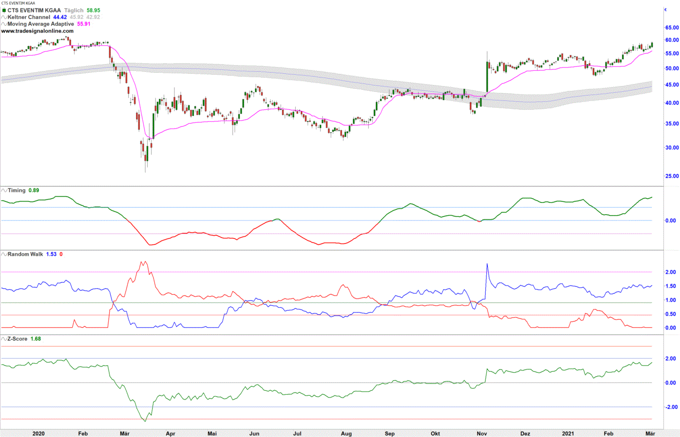 Die Aktie des Tickethändlers und Konzertveranstalters CTS Eventim gehörte gestern in einem allgemein schwächeren Börsenumfeld zu den stärksten Titeln im MDax. Mit einem Kursanstieg von 2,2 Prozent schob sich der Kurs bis auf 58,95 Euro nach oben. Dies bedeutete das höchste Kursniveau seit dem 21. Februar des vergangenen Jahres. Gleichzeitig bestätigte die Aktie den im März 2020 begonnenen Aufwärtstrend. Die langfristige Aufwärtstrendgerade verläuft aktuell bei ungefähr 45 Euro knapp oberhalb der 200-Tage-Linie und steigt mit ca. einem Prozent pro Woche an. Eine zweite Aufwärtstrendgerade mit Ursprung am Oktober-Tief bei etwa 37 Euro notiert aktuell bei knapp 53 Euro. Die Steigung beträgt hier etwas mehr als zwei Prozent pro Woche.